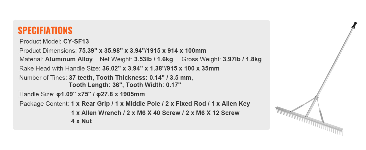 Rake Head Size: 36.02" x 3.94" x 1.38"/915 x 100 x 35 mm